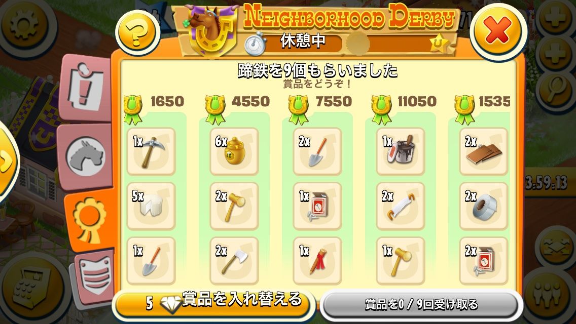 【ヘイデイ】ダービーの結果(12/20~12/26)→金のプラカードゲット! 2016年12月27日 前回と同じコミュのまま、所属5週目。今週もチャンピオンリーグ。304~320までお仕事9回クリア。今回はトラック多め。今週もずっと1位をキープ。結果は…そのまま1位。今回の賞品ダイナマイト×4・金のプラカード×1・TNT爆薬×4入賞賞品にもバナー?と思ったら違った。違いがよくわからない…蹄鉄の賞品はこちら。バナーがなくてがっかり。でも金のプラカードもらったからまあいいや。 「ヘイデイ」カテゴリの最新記事 < 前の記事次の記事 >